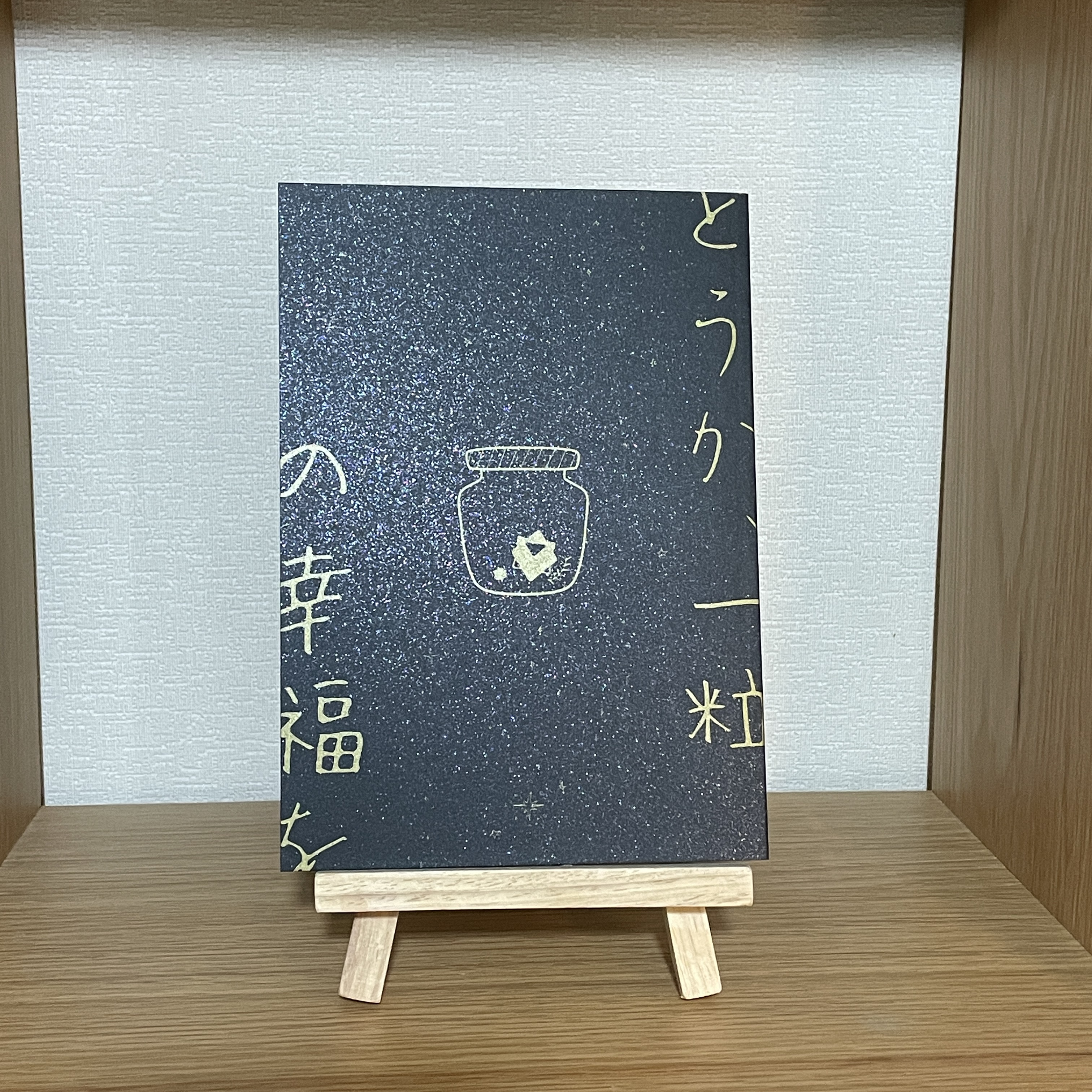 特殊紙・特殊インクが使える期間限定セットで印刷してもらった本です。話の静かな雰囲気と装丁の雰囲気がマッチしていていいです。祈りのような表紙のきらきらがより映える。